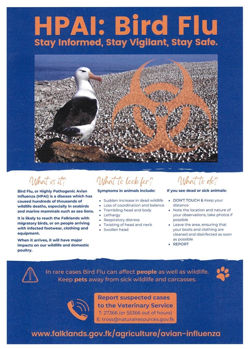 This page is to keep the public informed of Avian Influenza (Bird Flu) in the Falkland Islands. This includes what to look out for, who to contact and the latest Press releases.