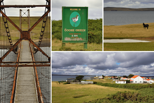 Bodie Creek suspension bridge; Goose Green sign; horse in front of shipwrecked garland; Goose Green