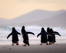 Picture yourself strolling along pristine white‑sand beaches, wandering through rolling sand dunes, and meeting the iconic penguins that call the Falklands home—all just steps away.
