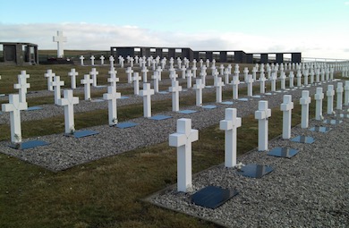 Located near Darwin settlement on East Falkland, the Argentine Cemetery contains graves marked with individual white crosses, many adorned with rosaries and flowers. It is flanked on the south side by a memorial wall with a central figure of the…