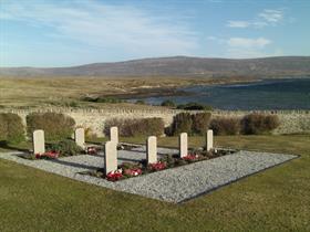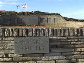 On 21st May 1982, British troops were landed at San Carlos. Overlooking the now tranquil inlet of San Carlos Water, the Cemetery is constructed in the form of a corral and is dedicated to “the South Atlantic Task Force and to the abiding memory of the sailors, soldiers and airmen who gave their lives and who have no grave but the sea here beside the graves of their comrades”. The memorial records the names of those who died. The Cemetery is easily reached by road at the far side of the settlement.