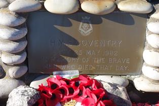Located on Pebble Island in the northwest of the archipelago, the HMS Coventry memorial is a simple cross atop a cairn close to First Mountain, west of the settlement. HMS Coventry was attacked by Argentine A-4B Skyhawks on 25th May 1982. She had been on picket duty with HMS Broadsword acting as an early warning system and first defence.
