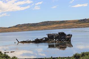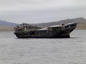 West of the 1914 Battle Memorial in Stanley Harbour lies the wreck of the Jhelum. Launched in Liverpool in the UK in 1849, the Jhelum suffered damage on its journey from Callao to Dunkirk around Cape Horn, while carrying a caro of guano for use as fertiliser. She limped into Stanley in 1870 where she was deserted by the crew who deemed her unsafe.